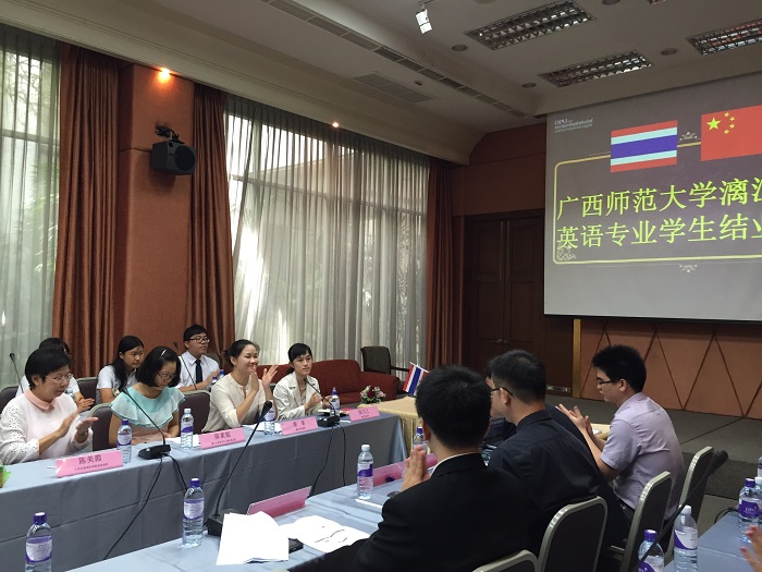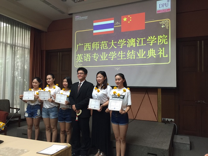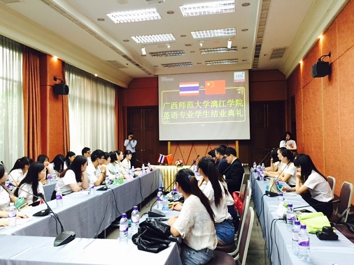 2015年7月4日上午09:00,广西师范大学漓江学院短期交流学生结业典礼在泰国博仁大学东盟国际学院学习交流活动举行。学院为表示对此次短期留学生活收获表彰和总结。博仁大学CAIC学院教学院长林正杰院长,教学秘书长游翔老师,会计与金融系系主任连兆龙老师,陈美霞老师,陈素妮老师,以及漓江学院的庞菲老师,张习之老师和同学出席此次结业典礼。会上各位老师对本次短期交流学生的表现给予了高度赞扬,同学们也对各位老师的辛勤付出表示感谢。任课教师陈美霞,陈素妮老师用简单的话语表达了她们最真诚的心声,令在场的同学们十分感动。学生代表赖佳辛怡发言:“这是一次崭新的机遇和挑战,此行的意义在于把这次经历累积的经验运用在将来学习生活当中,这次游学为大家提供了一个开阔视野、开拓思维的机会,期待下一次相遇。”发言结束后,为表彰一个月来同学们的学习表现,博仁大学特发证书以资鼓励。