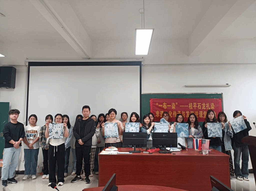 10月24日上午,翻译教研室熊惠琴老师在至善楼3411教室开展了“口译译前准备之非遗技艺扎染进课堂”公开课活动。本次公开课以《英汉口译》课程的“口译译前准备技巧”章节为依托,邀请2023年立项的“‘一布一染’——桂平石龙扎染非遗文化传承与发展”大学生创新创业团队进课堂展示和传授非遗技艺、现场制作扎染作品。