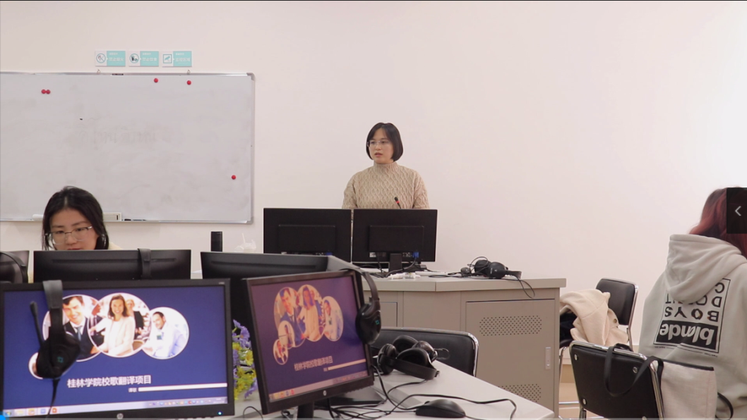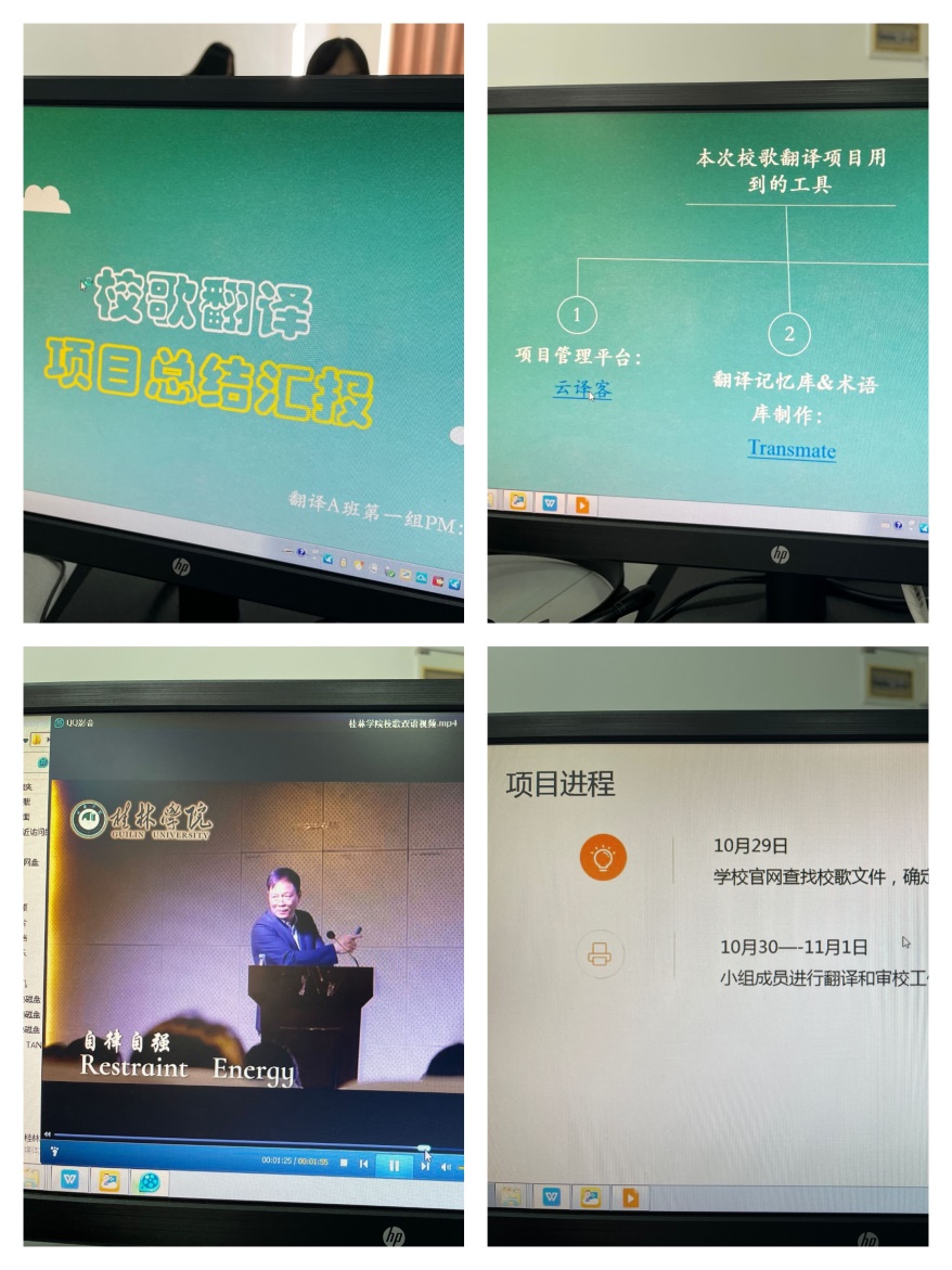 公开课由谭敏老师主讲,内容为“桂林学院校歌翻译项目实战”,授课对象是2018级翻译方向A班的学生。谭敏老师采取以工作过程为导向的教学组织及实施形式,课前教师以甲方身份给各学生项目组发放项目、布置项目要求,学生利用课后时间在各自小组项目经理的带领下完成制定计划、分析待译材料、查找术语和平行文本、翻译转换、译文审校、质量监控、排版处理、翻译定稿、提交任务项目等工作,并由各组项目经理在课上进行项目总结,教师从甲方角度点评学生项目完成情况,给予意见和建议。