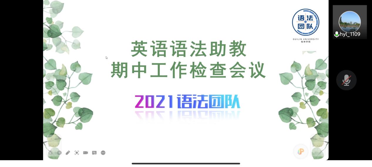 为了进一步推进我院英语语法课程助教工作的开展,4月17日晚,语法团队英语语法助教期中工作检查会议在腾讯会议召开,黄彦立老师主持会议,唐茂妮老师、蔡晓明老师以及八位2020级语法助教参加会议。