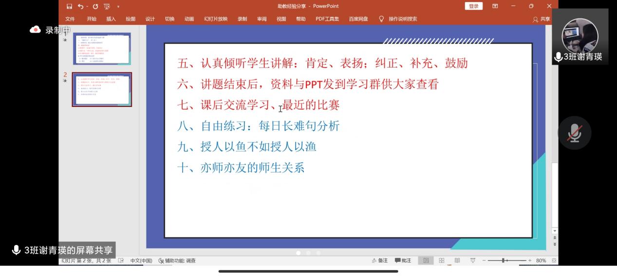 经过今天的工作经验交流会,相信助教们在今后的工作中会更认真、更得心应手,互相学习,取长补短,及时调整教学方法,和老师们一起培养出更多的人才。