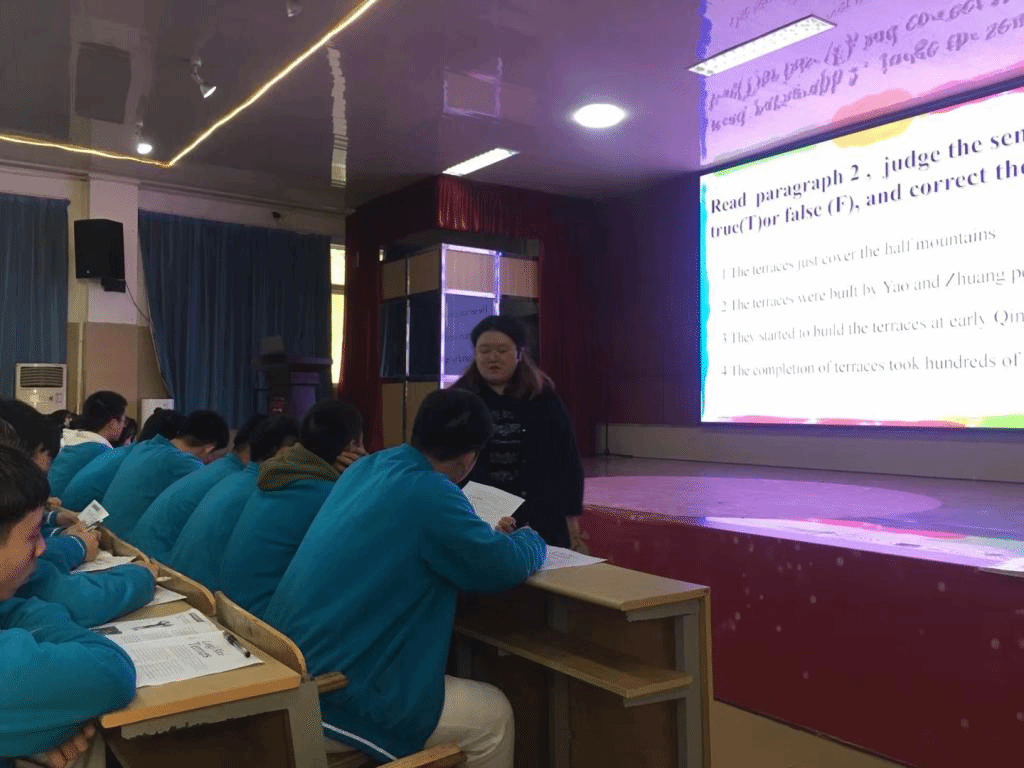 任远中学高中部张源老师和我校实习生马强芳同学用不同的方法,展示了两堂各具风格的人教版高一英语Longji Rice Terraces一课。首先,桂林学院实习生马强芳同学采用PWP模式,图片引入,激起学生的学习兴趣,引领学生完成了阅读任务。整个教学过程清晰,层次分明,发现学生的语音错误时及时进行了纠正。张源老师则是用生本模式,以学生为本,歌曲导入,全班齐唱英文歌后围绕课本主题编写剧本,最终以话剧的形式在课堂上呈现。这种教学模式让学生全部参与了课堂教学,调动了学生的积极性,使课堂变得生动有趣。两位老师所使用的教学模式各有千秋,最终呈现了两种完全不同风格的精彩课堂教学。