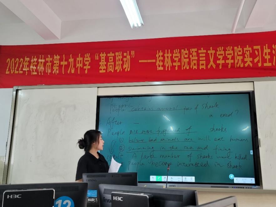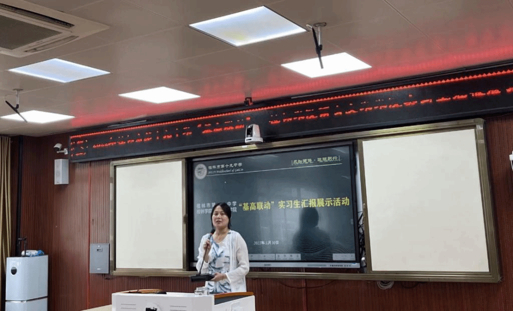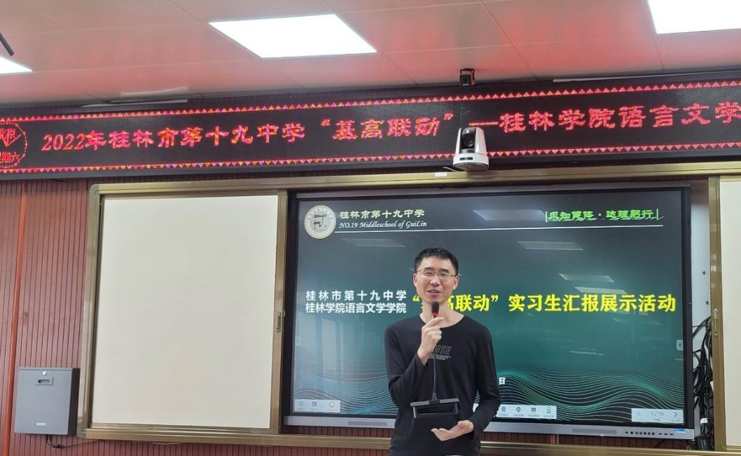 实习生汇报试讲是实习生在学校学习阶段重要的实践性教学环节之一,是理论与实践相结合的重要方式,是提高学生政治思想水平、业务素质和动手能力的重要环节。为检测学生实习成效,5月30日下午,语言文学学院在桂林市第十九中学开展了实习生汇报试讲活动,目的在于检验并及时了解实习生的教学能力和常规教学技能的掌握情况。桂林市学科带头人、教学能手等市级骨干教师,桂林市第十九中学学术委员会及校生本骨干,语言文学学院张超锋副院长一行5人,及全体实习生参与了本次活动。