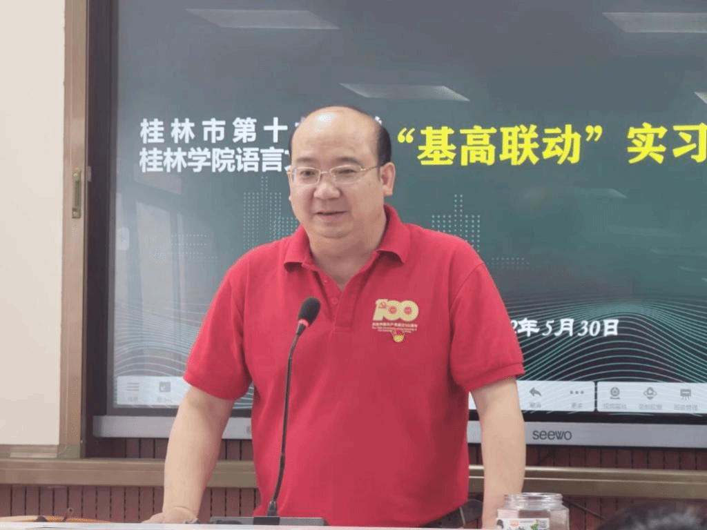 第二环节在录播室进行汇报展示活动小结。首先,桂林市第十九中学程晓玲副校长对本次活动进行了点评,希望借此次试讲活动锻炼实习生,展示实习生教学成果,同时希望实习生能够在未来教育工作者的道路上不忘初心,砥砺前行!随后,张超锋副院长发言,感谢桂林市第十九中学精心举办的本次活动,让实习生得到了锻炼,感谢指导老师在三个月期间给予实习生的细心指导和鼓励,让他们在专业知识和教学能力等方面得到了提升,为今后的就业打下了坚实的基础。最后,桂林市第十九中学蒋文荣校长针对此次试讲活动进行了总结,他充分肯定了试讲实习生的表现,希望借助本次活动对实习生三个月的实习作一个公正、公平、公开的评价,期望在周四的同课异构汇报展示中,指导老师和实习生能展示不同的设计思路,展示自身教学风格,进行思想的碰撞,达到共同进步,共同提高的目的。蒋校长表示教育是一个不完美的人引领着一群不完美的人追求完美的过程,希望实习生在未来的教育工作中能再接再厉,早日成为一名优秀的英语教师。
