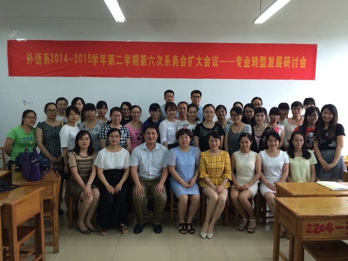 会后全体老师进行了合影留念,大家纷纷表示此次会议内容丰富,重点突出,会议进一步统一全系发展转型的思想,看到外语系日新月异的变化大家都很激动,此次转型发展研讨会议的举办非常有意义,老师们各抒己见,畅所欲言,将长远目标与近期措施相结合,把思想转化为行动,积极推动外语系的转型发展。
