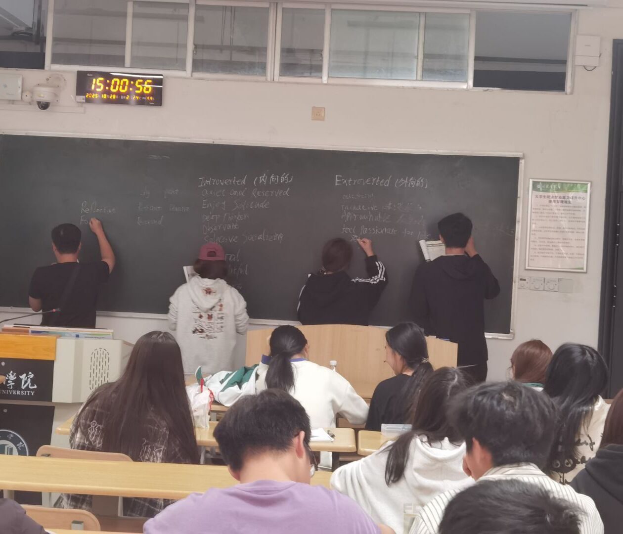 公开课以“Friendship in College”为主题,授课教师采用“情境导入+实践深化”的教学模式。课堂伊始,教师以“My best friend”口语练习切入,引导学生主动分享与挚友的暖心故事及对友情的独到理解,现场互动氛围热烈;在精准点评学生发言后,教师围绕“外貌、性格、兴趣爱好”三大维度,系统讲解高频描述类英语词汇,为语言实践筑牢基础。为激发学生主动性,教师还结合网络流行的“I人/E人”社交概念设计分组竞赛——限定时间内,各小组需查找并在黑板列出描述两类人群的英文词汇,以词汇量定胜负。学生们踊跃分工、积极抢答,不仅拓展了课外词汇储备,更在协作中提升了语言运用能力,课堂氛围持续升温。