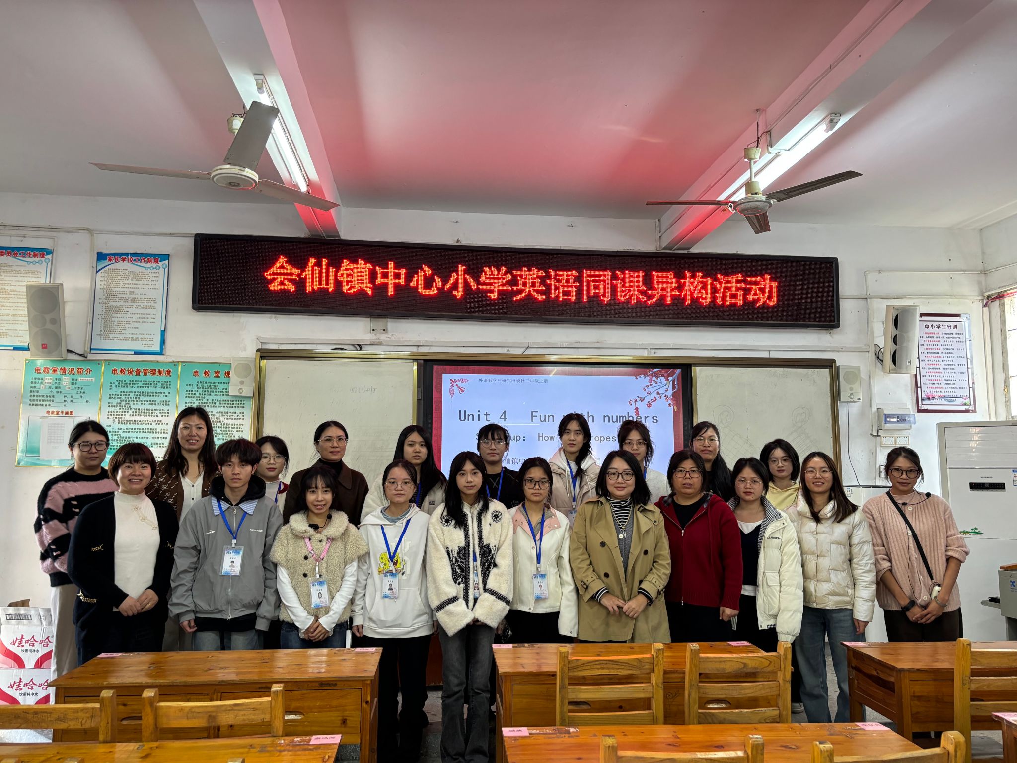 为深化小学英语课堂教学改革,搭建校地教研交流平台,促进教师专业成长与教学质量提升,近日,学院与临桂区会仙镇中心小学联合举办“同课异构”教学研讨活动。本次活动围绕外研版小学英语Unit 4 Fun with Numbers展开,会仙镇中心小学潘颖颖老师与学院实习生梁敏同学同台授课,以差异化教学设计呈现别样教学风采,会仙镇中心小学师生代表、学院教师及实习生参与活动。