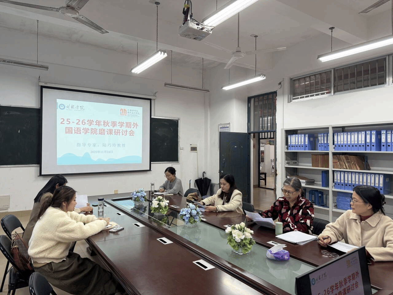 活动期间,陆巧玲教授全程深度参与,先后走进《综合英语》《商务英语写作》《中国文化概论》等课程课堂。听课过程中,她重点聚焦课堂互动设计、文本解读逻辑及教学目标达成度,细致记录教学亮点与优化空间,既肯定了授课教师对教材重难点的精准把握,也指出了课堂参与度、文本理解效率等方面的提升方向。