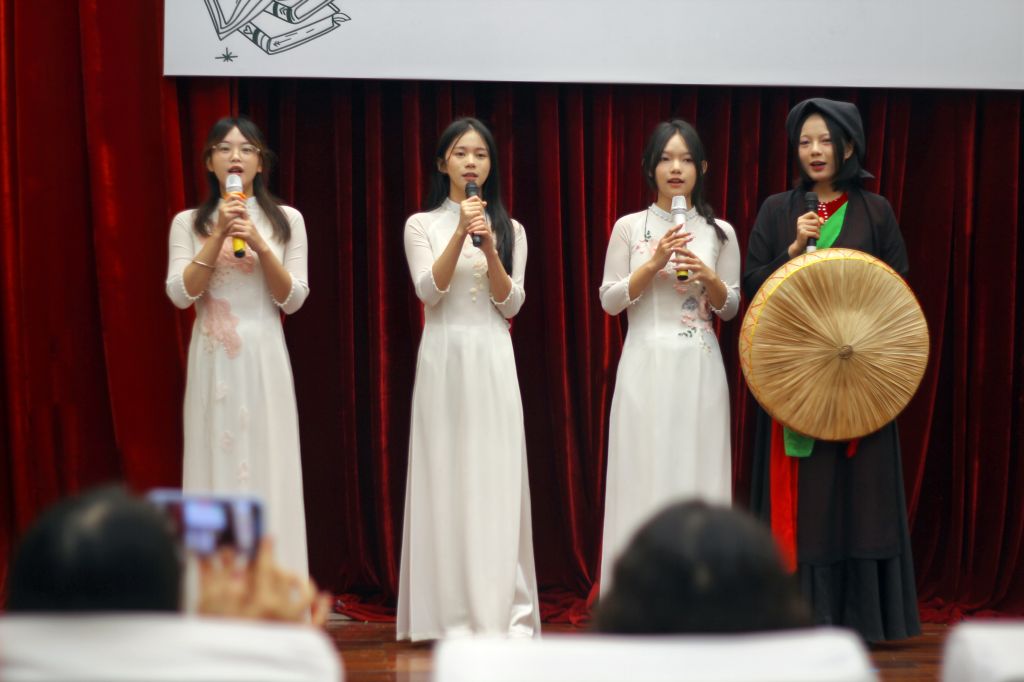 施海清、梁倩颖、谭惠丹与河内师范大学的范芳雯同学(右一)共同表演