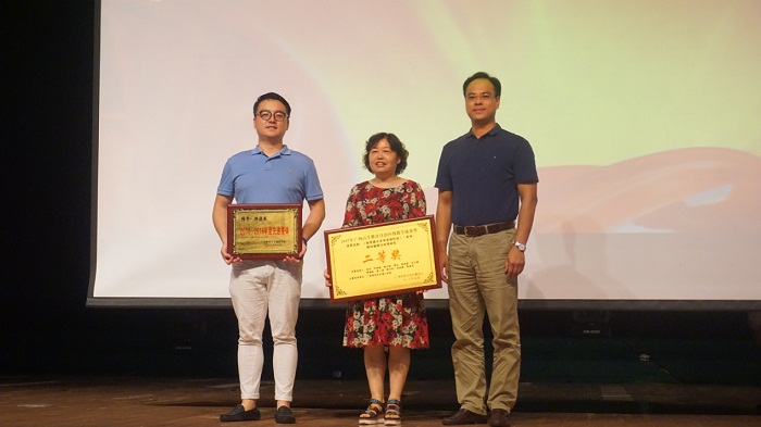 在表彰阶段,大会首先对2016-2017学年参加“广西师范生技能大赛”,“全国大学生英语竞赛”等数十项大赛的获奖学生及指导老师代表进行了表彰,然后对在本学年为外语系做出卓越贡献的参赛获奖老师,“教学之星”,“先进党员”等老师代表进行了表彰。在表彰阶段最后,邓志平亲自为荣获2017年度自治区教学成果二等奖的外语系主任何玲老师以及2014-2016连续三年被学院评为“先进集体”的外语系陈俊杰书记颁奖。