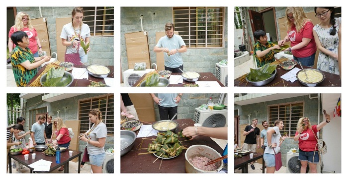 外教们一进门就感受到亲朋好友欢聚一堂的节日氛围。首先,一位老桂林手把手的教外教们制作端午节粽子,从粽子的材料到制作技艺都由外语系师生进行英文解说,外教们纷纷动手参与其中。接着,外教们还参与了酿苦瓜、吃“五子”、挂菖蒲、洗艾澡等各种桂林风俗文化之中。