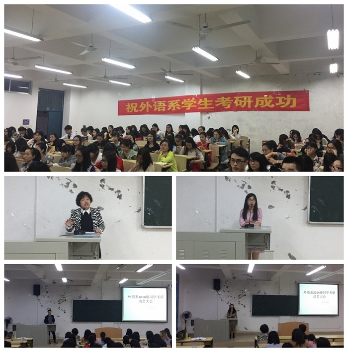 近日,外语系在1104教室召开了2014级学生考研动员会。外语系主任何玲教授、外语系教师吕佳微、蔡恒、13级学生陈连娟,以及全体2014级外语系学生参加了会议,大会由外语系教师秦一涵主持。