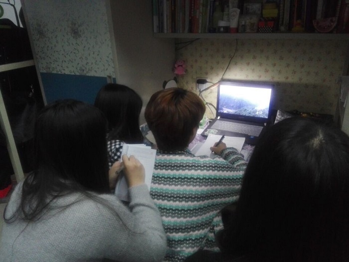 外语系2014级115寝室成员认真观看学习《长征》,仔细做学习笔记。