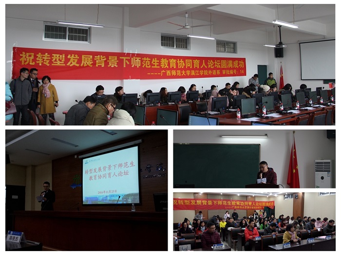 11月25日,“转型发展背景下师范生教育协同育人论坛”在我校举行,出席本论坛的嘉宾有我校副校长章冬兰老师、国际交流中心主任凌忠老师、教务处副处长李明阳老师、外语系主任何玲老师、以及桂林市第八中学党委书记梁隽老师、第十六中学校长朱建农老师、第十一中副校长伍异文老师的,以及来自四所实习基地的40多名外语系的校外实习指导老师。