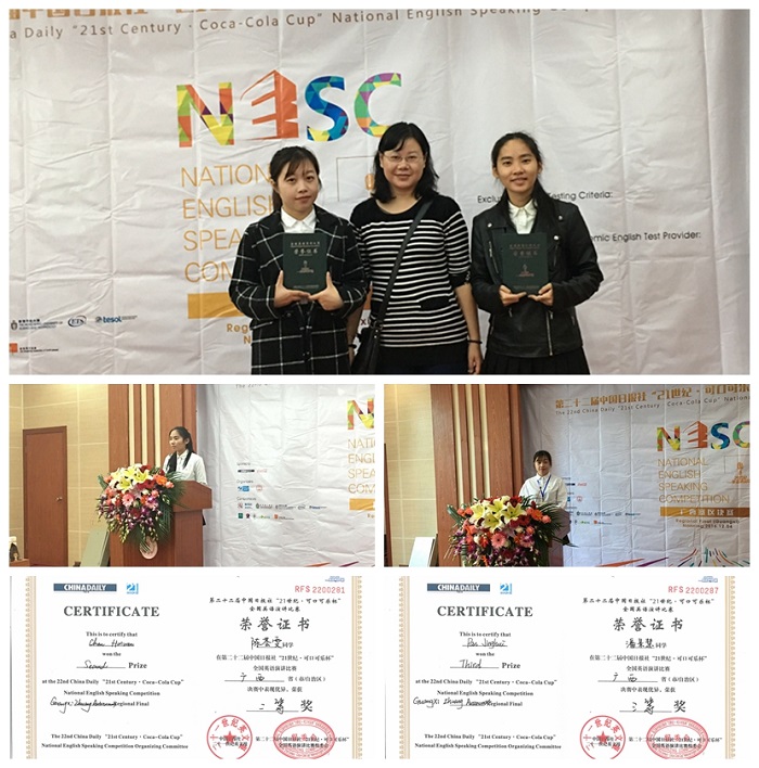 2016年12月4日上午,由中国日报社与可口可乐大中华区联合主办、二十一世纪英语教育传媒承办的第22届“21世纪·可口可乐杯”全国英语演讲大赛广西区决赛在广西外国语学院学院落下帷幕。我校外语系2014级翻译专业陈荟雯、2015级英语专业潘景慧两名同学在决赛中表现优异,分别获得广西赛区决赛二等奖和三等奖。