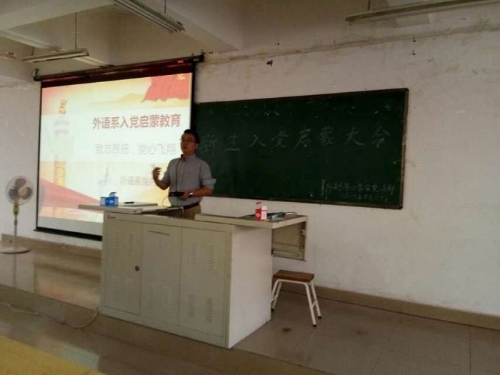 为了让2016级外语系新生更好地了解党的基本知识、掌握入党要求和入党程序,鼓励2016级新生积极向党组织靠拢。10月13日,外语系党总支在001教室举办了新生入党启蒙系列教育活动。参加本次大会的有外语系党支部书记陈俊杰、第二学生党支部党员、预备党员和2016级全体新生。