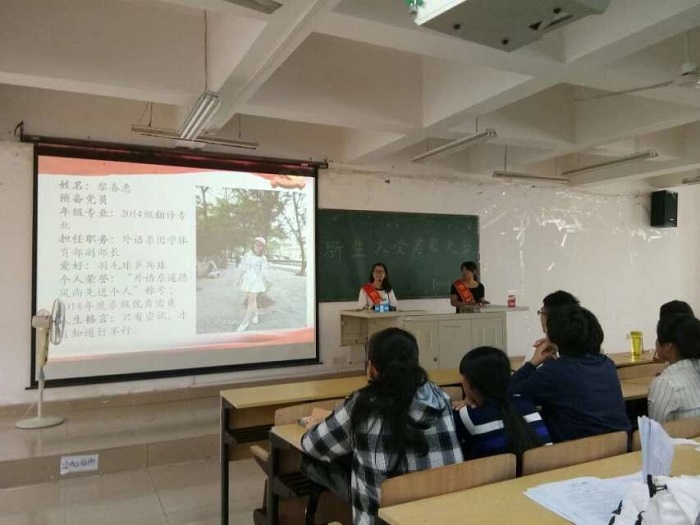 随后,外语系高年级党员范义萍同志为2016级新生介绍推优成为入党积极分子的条件,强调了递交入党申请书,成绩和无违纪现象的重要性,然后结合日常生活讲党建活动。大会特别提到要端正入党动机和入党态度,主要是想说明党员的标准是密切联系群众,为共产主义事业奋斗终身,为国家贡献自己的一份力量。大会接近尾声时由党员李斌和预备党员黎春惠讲述他们与党之间的一些事,让新生可以增强他们对党的理解,此外,他们还提出对新生的希望,并告诫新生要有入党的信念以及决心,端正自己的态度,严格要求自己,争取早日成为一名优秀的党员。