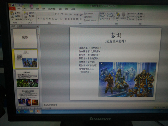 2016年10月28日,13级翻译专业《笔译工作坊》课程开展了第二次专题翻译项目译文分享会,此次分享会的主题是:游戏翻译专场------以魔兽世界为例。课前,同学们以项目组的形式,在各组项目经理的组织下,事先完成了语帆试译宝网络平台上的游戏翻译专场译文,总结了相关专题的术语表、翻译记忆库和平行文本。由于此次翻译专题的专业性较强,大部分同学此前未接触过《魔兽世界》这款游戏,缺乏对游戏剧情背景的了解,在翻译时遇到很多困难,因此,谭敏老师邀请一位资深魔兽游戏玩家—-我院艺设系的宁淇同学担任此次游戏翻译专场的领域专家。课上,各项目组译员首先分享了各自的译文,对译文中涉及游戏情节的内容向宁淇同学提问,宁淇同学现场给予回答。待译文分享完毕后,宁淇借助PPT和视频,为翻译专业同学梳理了《魔兽世界》这款游戏的故事大纲。