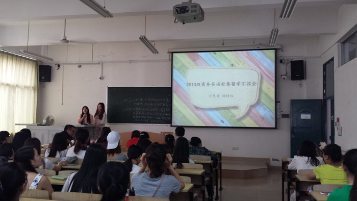 6月15日下午2013级商务英语赴泰留学汇报会在1311教室举行,出席汇报会的嘉宾有外语系领导班子、商务英语教务室全体教师。2013级2014级2015级商务英语专业的全体同学也到场参加此次汇报会。