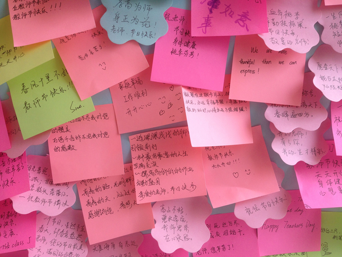 首先,外语系团总支学生副书记邹媛媛同学代表外语系团学所有成员们赠送礼物给外语系团总支书记石仁春老师;同时,团学各部门工作人员们也积极为老师们打扫办公室,以便减少老师们平日里工作的辛劳;外语角的展板也布置完毕,上面一张张颜色艳丽的便签纸记录着同学们对老师们衷心的祝福,成为一道靓丽的风景。
