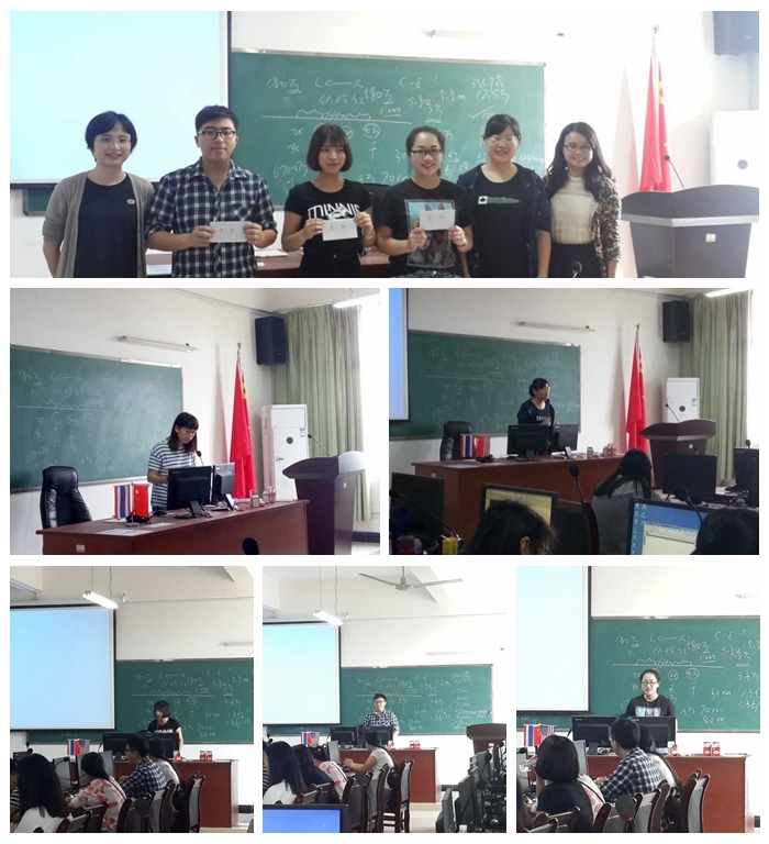 其次,刚结束口译大赛复赛的三位选手分别上台分享自己的参赛感想,他们纷纷表示,这次比赛一定程度上开拓了视野,在分析不足的同时也不断鞭策自己向更高一个层面发展,最后鼓舞在场的成员们积极参与这方面的锻炼,在对比中前进。