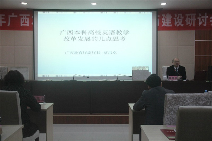 研讨会上,广西教育厅副厅长蔡昌卓结合“一带一路”战略背景,分析了广西英语教育现状,并从教师能力、教学方法、广西教育特色化等几个方面分享了几点思考。北京航空航天大学外国语学院院长向明友在其所作的“与外语同行论教学话科研”专题介绍中,结合个人教学经验,阐述了教学教研互补互换的独特思路。