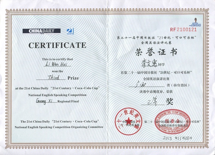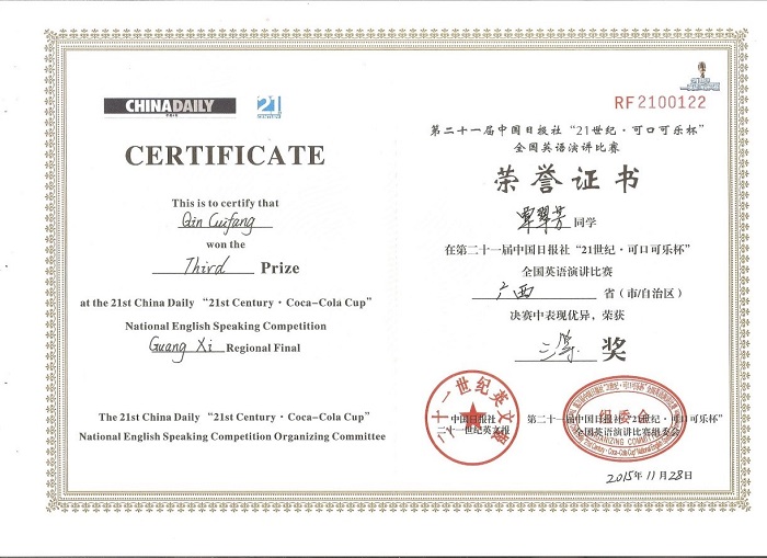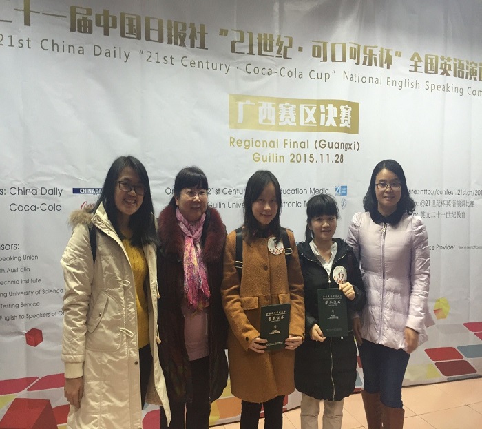 近日,继我院外语系学子在“外研社杯”全国英语演讲获得广西区三等奖和优胜奖的消息之后,捷报不断。在2015年11月28日于广西桂林电子科技大学举办的2015年“21世纪*可口可乐杯”全国演讲大赛广西区决赛中,我院外语系2013级英语专业学生覃翠芳及2014级翻译专业学生李文慧表现优异,分别获得了三等奖的好成绩。