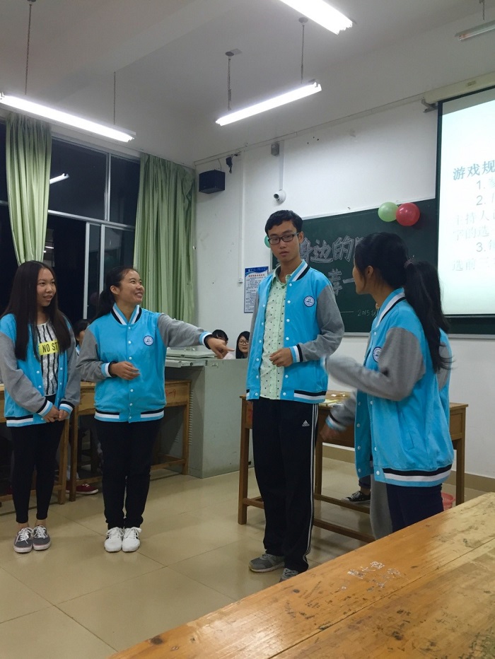 本次主题班会邀请了辅导员石仁春老师、泰国外教蔡鹏宇老师、2013级翻译专业的学长学姐以及外语系2015级各班委代表参加。班会中,同学们积极踊跃上台推荐自己喜欢的书籍,把在场观众带入了书海世界中,开拓了同学们的视野。在游戏环节中,好书推荐人和全体同学玩起了“数数说书名”的游戏,现场气氛活跃,同学们在欢声笑语中收获了很多好书。最后,辅导员石仁春老师为此次主题班会做了精彩总结。