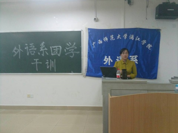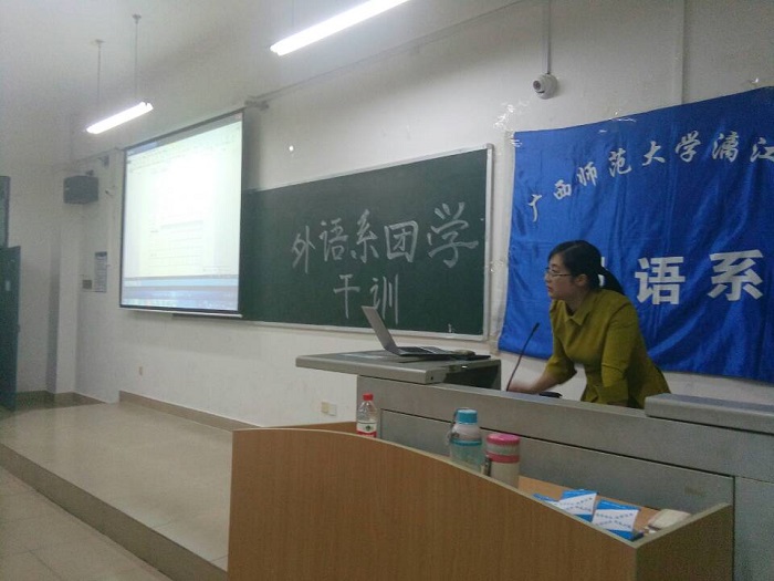 为更好增强我系团学干部的综合素质以及计算机应用能力,增强团学的凝聚力,10月13日晚上,外语系在1403教室成功举行了系团学的干部培训。当晚,有幸邀请到系基础语言教研室主任汪婧老师前来担任此次讲座的主讲人。汪靖老师所带领的团队在2014年全国多媒体课件大赛中荣获二等奖、在广西壮族自治区教学软件大赛及微课大赛中均荣获奖项,在现代教育技术运用方面有着及其丰富实操经验。