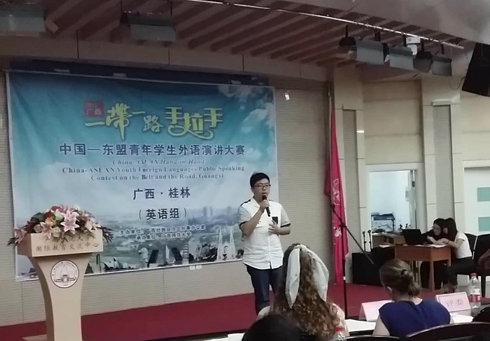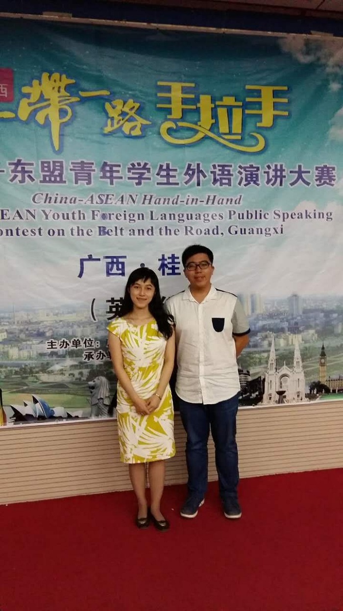 2015年10月14日晚,我院外语系13级翻译专业凌志行同学经翻译教研室老师张习之、谭敏带队和指导,在广西师范大学育才校区国教院参加了“中国-东盟”青年学生外语演讲大赛英语组的竞赛环节。此项赛事是由自治区外事办主办的高级别赛事,以“一带一路手拉手”为主题,旨在增进广大青年学生对“一带一路”战略的深入了解。在演讲过程中,来自各大高校的大学生以及研究生依次登台亮相,展现自己的外语水平以及演讲技能。为保证比赛的公平公正以及专业性,评委由母语为英语的外籍教师以及蔡马兰老师等经验丰富的英语专业教师出任。