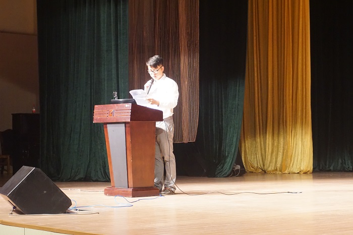 观看完学院宣传视频后,来开了师生见面会的大幕。首先,外语系主任何玲副教授上台为新生致辞,她介绍了学院和外语系的办学历史,详细解析了“厚专业、重实操、行至善、甲天下”系训,并对英语、商务、翻译、越南语和泰语五个专业的课程设置等各个方面的情况进行讲解。她鼓励同学们在适应中成长、树立学习目标。紧接着教师代表孙建国老师发表了讲话。他重点强调,大学学习,靠的是“师傅领进门,修行靠个人”的钻劲,强调学生在专业老师的指导下应更系统的学习专业知识,用于实践,为未来走向社会打下扎实的基础。他还强调在大学的黄金时期,希望同学们努力奋进,积极向上,成为一名优秀的外语学子。系团总支学生副书记梁月明代表全体老生在接下来的环节中对新生的到来表示热烈欢迎,她道出,大学三年里,通过不懈努力,自己从不敢开口讲话的怯懦胆小到参加全国英语演讲比赛的大方勇敢的蜕变。她希望通过自己的亲身经历向新生们传递一条信息:“不畏辛苦,方有收获”。外语系新生代表也发表了在高考过后不一样人生的感悟。