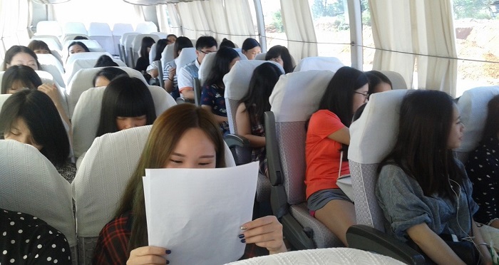 (同学们在校车上紧张地准备联络口译及视译内容)