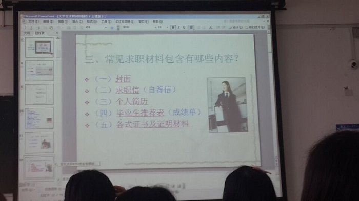 同时, 在学院为2012级同学们开设的就业指导相关课程上,专业老师为同学们讲解简历制作的相关知识,同学们将课堂上学习到的技巧运用到实际的简历制作中,上交了一份份精良的简历作品。