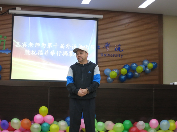 最后,学院副院长刘林海为本次开幕仪式致词。他不仅肯定了外语系在过去十年里取得的丰硕成果,更对全体外语人在过去十年中积极提升广大师生的外语应用能力,营造良好的校园外语文化氛围而做出的不懈努力表示感谢,并表达了对本届文化月寄予的深厚期望与诚挚的祝愿。
