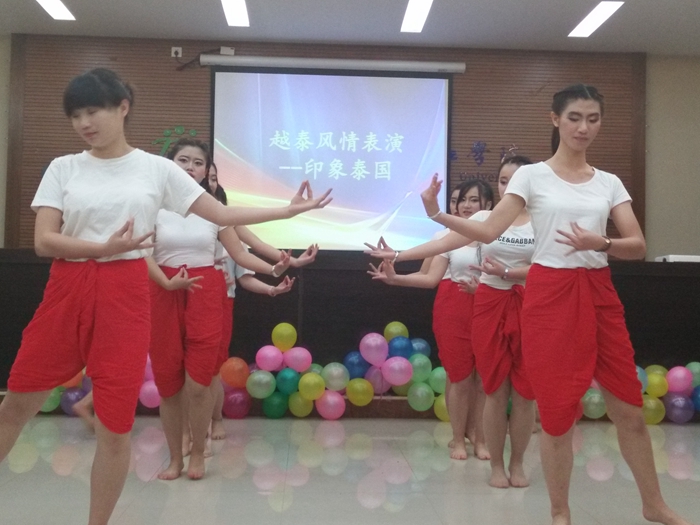 怀揣着对本届文化节的期盼,来宾们一起观赏了第十届外语文化节的预告片和各子活动的详细介绍,丰富多彩的专业活动深深的吸引着嘉宾的目光。期间的中场表演更是充分结合外语特色。《梦想十年,深情母校》英文诗朗诵极大地渲染了全场的气氛,使大家沉浸在英国古典文学的殿堂之中;越、泰专业同学们的泰舞表演《印象泰国》,无论是异域独特的音乐,亦或是其优美的舞姿,都使人如同置身于异国一般。开幕式在嘉宾们阵阵掌声中被推向高潮。