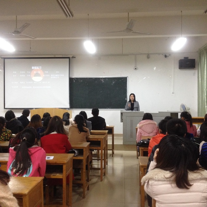2014年12月12日晚,外语系在1503教室召开2015届毕业生实习总结大会。会议由年级辅导员李张燕主持,外语系副主任肖立章,各实习指导老师及2015届全体毕业生参加了总结大会。