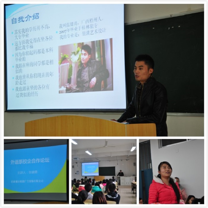 2014年12月26日下午,我院外语系教师以及商务英语专业学生代表共80人在1310教室举行了“外语系校企合作发展论坛-我的创业故事”讲座。此次论坛邀请桂林市城市便捷设计公司总经理张建勇先生担任主讲,会上张建勇先生从“创业”的角度给师生们讲述了自己跌宕起伏的创业历程,真实的创业故事及用心做事、永不言弃的创业精神令在场师生钦佩不已;在讲座的互动环节,同生们争相提出了各种与创业、公司管理有关的疑问,张先生耐心、务实而不失风趣的解答博得了同学们阵阵掌声。
