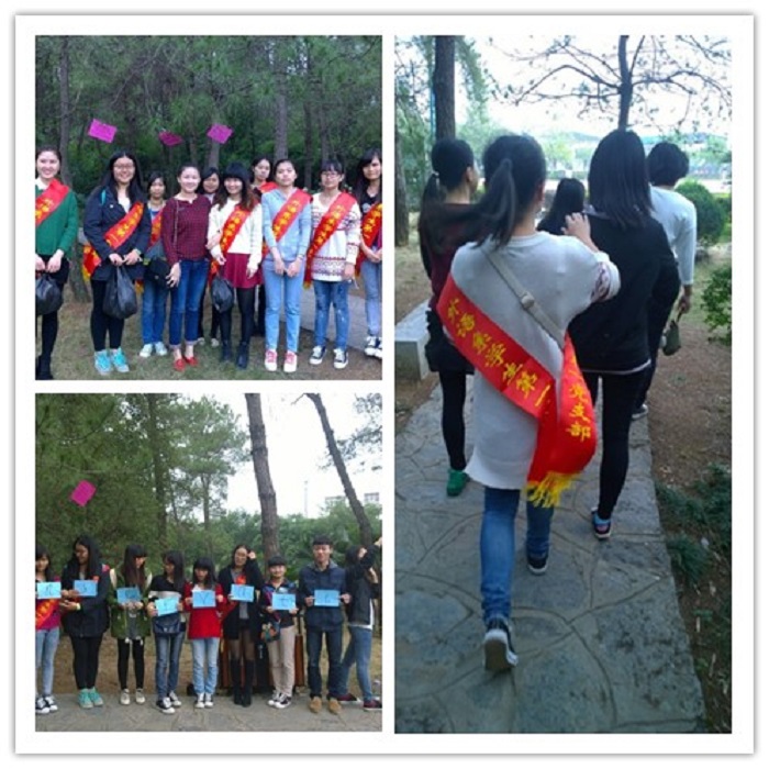 活动以一个小游戏为热身活动来展开。游戏规则是所有成员分为6组,在小树林内完成三个任务。第一个任务是找字母。树上挂着不同颜色卡纸,每队颜色不同,并需找出属于自己队伍的颜色的字母,拼成一个关于环保的单词。第二个任务是捡垃圾,每组必须捡满一个塑料袋的垃圾。第三个任务是张贴绿色环保标语,标语为英文标语。小游戏娱乐之余也彰显了外语系的特色。