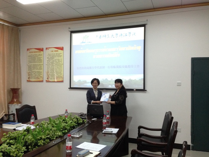 5月15日上午,成都大学外国语学院及“泰国研究中心”主任一行5人来我院外语系进行交流。外语系主任蔡马兰引导成都大学代表团参观了我院的办学环境,同时介绍我院的办学特色。随后,在3208会议室,成都大学代表团一行与我院泰语专业教师举行座谈会。