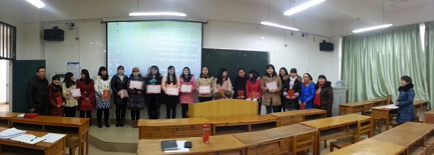 随后,何玲副主任对本学期的教学和科研工作作了总结。她强调,本学期外语系在教学、科研工作中取得了很好的成绩,如在全国、广西区及学院的多媒体比赛、教师技能比赛中斩获了多项荣誉。其中的代表金玲和汪婧两位老师上台展示了她们参加广西区教学软件大赛获奖的作品,赢得了老师们的赞誉。接着,何玲副主任对本学期表现优异的教师和教研室提出表彰。周德胜书记宣读了覃浩等15位老师获创新考核优秀教师的表彰名单,蔡马兰主任宣读了李琳等20位老师获优秀教师和先进工作者的表彰名单及大学英语第一教研室等4个教研室获优秀教研室的名单,并且现场颁发了荣誉证书。何玲副主任在总结中还强调了规范验收工作的重要性和目前存在的问题,要求老师们按照要求认真做好教学材料的整理等工作。