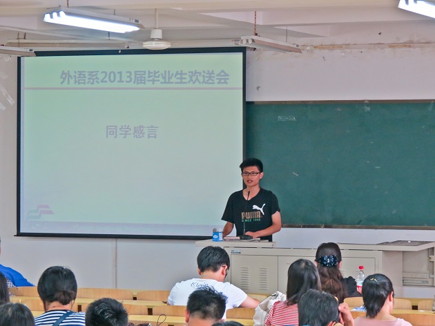 芬芳桃李惜别母校感恩情,辛勤园丁送行学子寄祝福。6月26日下午,外语系在001教室举行2013届学生毕业典礼。外语系领导和部分教师参加了典礼,典礼由系党总支副书记陈俊杰主持。