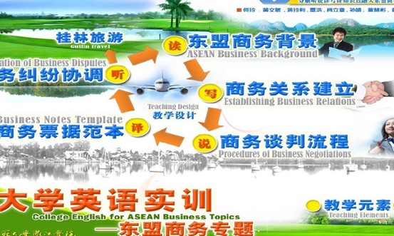 本届多媒体课件大赛,外语系设计的主题是《大学英语实训---东盟商务专题》,课件设计的理念充分体现独立学院如何按照教育部的要求,发挥高校教育服务地方经济发展的功能;整个教学设计的思路是以东盟为背景,以桂林丰华进出口贸易公司生产的竹木衣架为主要的交易商品,让学生模拟把桂林的“竹木衣架”销售到新加坡等东盟国家;课件的内容包括“东盟商务背景”、“商务关系建立”、“商务谈判过程”、“商务票据范本”、“商务纠纷协调”以及富有地方特色的“桂林旅游”模块;把培养大学生学习英语的听、说、读、写、译五种能力,合理分解、融合到东盟商务活动的过程之中。这是一个兴趣的过程,也是一个学习和提高的过程。