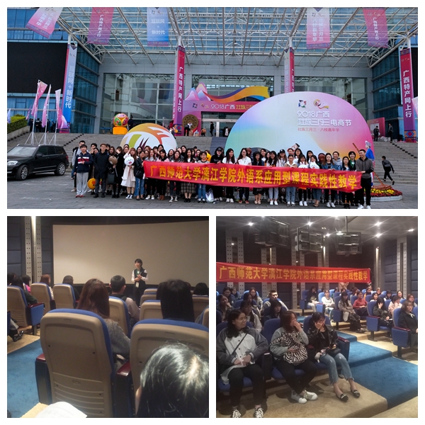 作为自治区“壮族三月三·八桂嘉年华”五大活动板块之一的2018广西“壮族三月三”电商节于2018年4月12日至14日首次在桂林国际会展中心举办。为了让同学们更加直观地了解一场展会的策划和筹备过程,更加深入地体验参展的流程,更加深刻地体会“会展经济”对当前社会发展的影响,4月14日外语系商务英语教研室的蔡恒老师(主授会展英语课程等)带队2016级商务英语专业同学赴桂林国际会展中心参加广西“壮族三月三”电商节现场展销会。此外,桂林国际会展中心业务部主管邹璐霞老师应邀为同学们现场普及展会的相关现场知识。