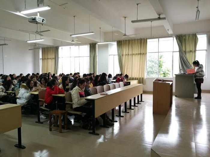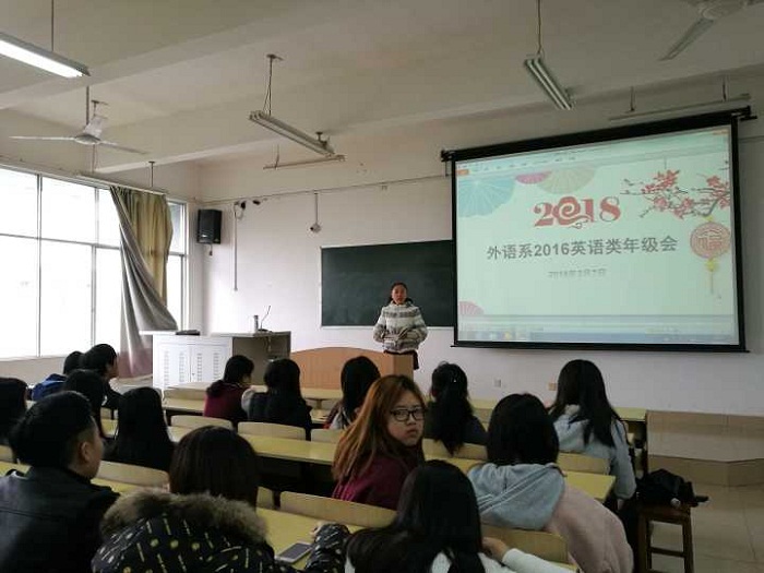 3月7日下午,外语系2016级在公共教学楼1412召开2017-2018学年第二学期首次年级会议。本次会议由外语系辅导员韦微主持,2016级英语类全体同学参加。