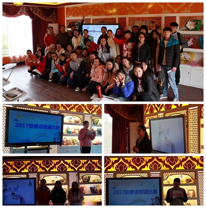 为了丰富校园文化生活,营造良好的泰语学习氛围,提高泰语专业新生学习泰语的兴趣和能力,2017年12月27日下午两时许,外语系泰语教研室在外国文化体验中心(泰国文化馆)举办“2017级泰语诗词朗诵比赛”。2017级泰语专业全体学生志愿报名参赛,泰语教研室全体教师出席并为该赛事担任评委。