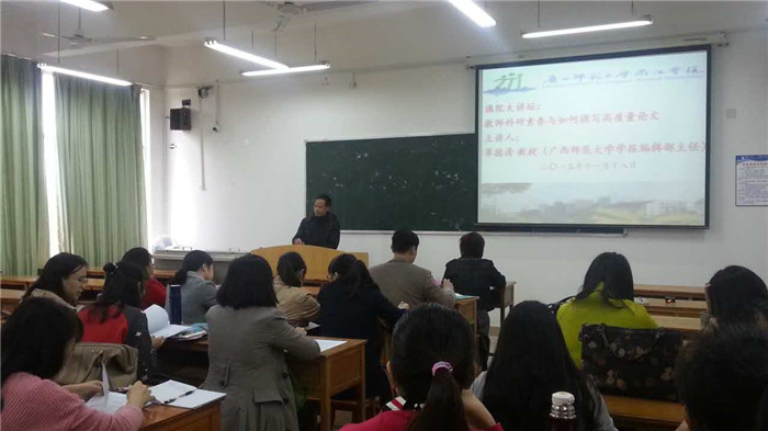 11月19日下午,广西师范大学学报编辑部主任覃德清教授应邀做客外语系,为师生们作了一场题为“教师的科研素养与论文写作”的讲座。外语系全体教职员工及理学系部分教师参加了讲座。