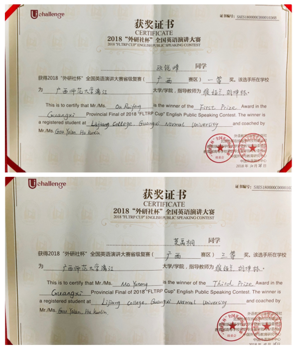 根据2018“外研社杯”全国英语演讲比赛组委会有关文件精神要求,广西区高校大学外语教学研究会于2018年10月28日在广西医科大学综合楼举行“外研社杯”全国英语演讲比赛广西赛区复赛。我校2016级国贸专业学生欧锐峰、2016级英语专业学生莫禹桐在区级复赛中表现优异,分别获得广西赛区复赛一等奖和三等奖。