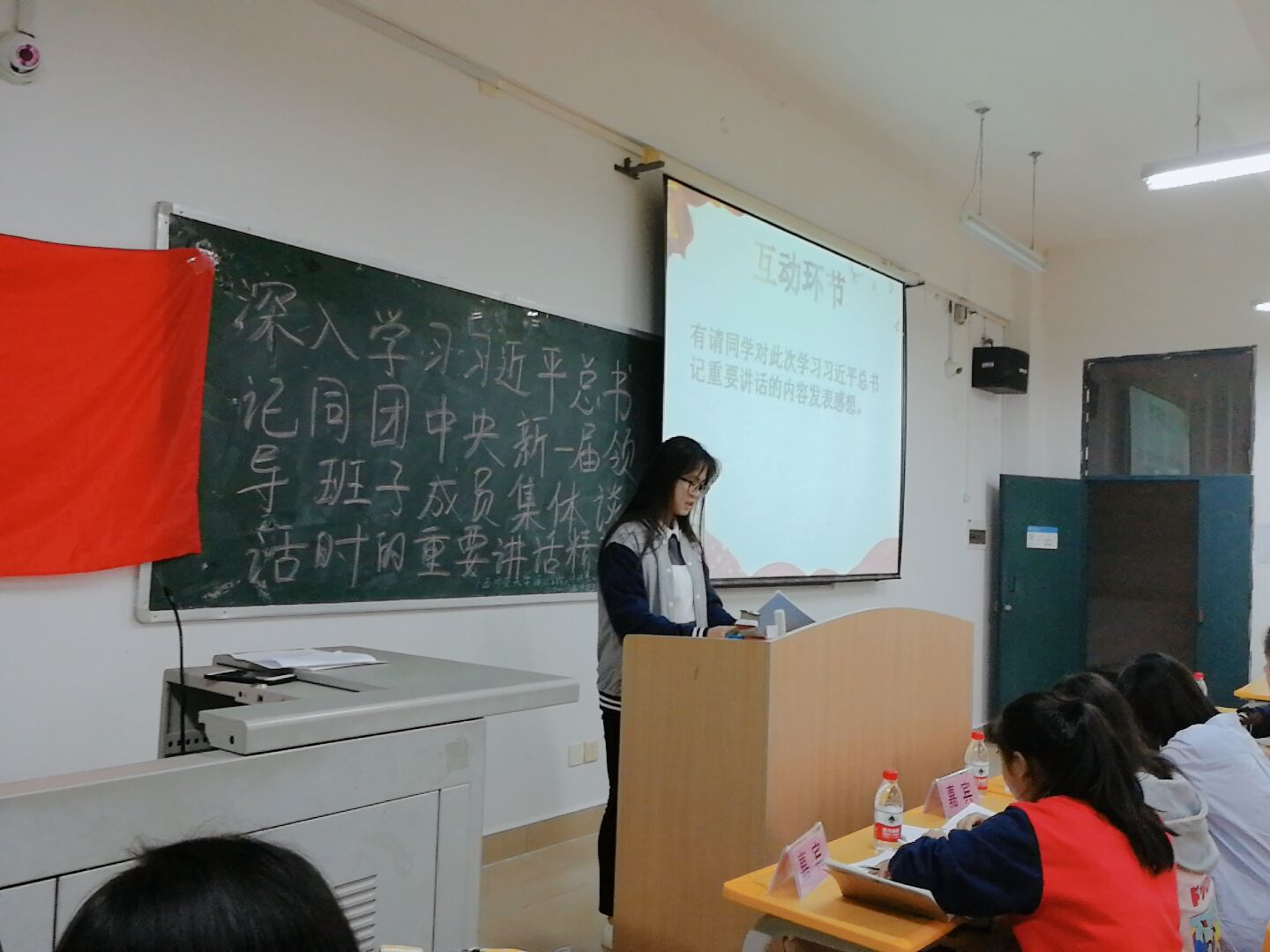 在主题团日活动上,主持人通过ppt为同学们讲解习近平总书记同团中央新一届领导班子成员集体谈话时的重要讲话内容。随后同学代表就讲话内容分享自己的学习感受,他们讲到,作为当代青年大学生,应该认真了解学习习近平总书记学习系列讲话精神,我们应努力学习,掌握专业知识,锻炼实践技能,为实现中华民族伟大复兴的中国梦扎实奋斗。