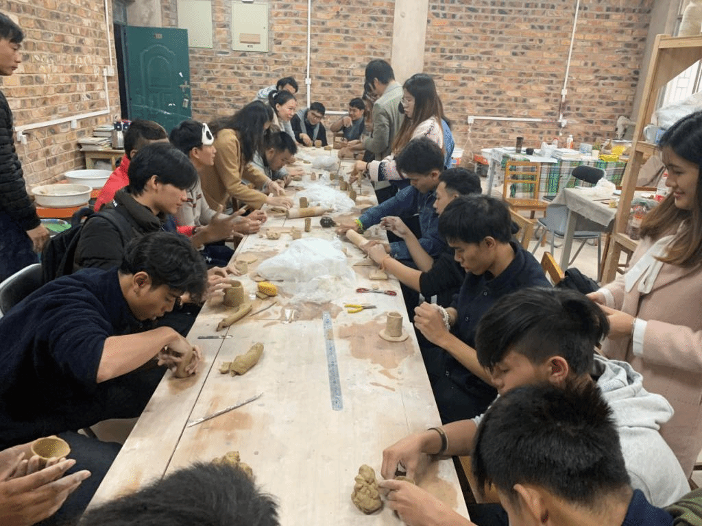2018年12月19日下午,2018级泰国留学生共四十四人在任课教师的带领下,分两组到艺术设计系陶艺工作室开展中国陶艺文化体验活动。我系2015级泰语专业十一位同学前往协助翻译。