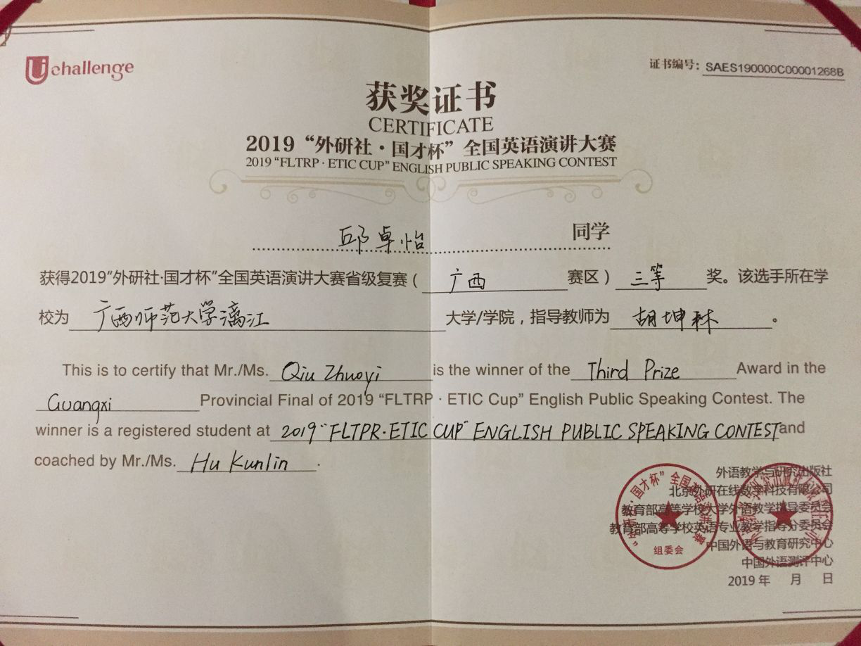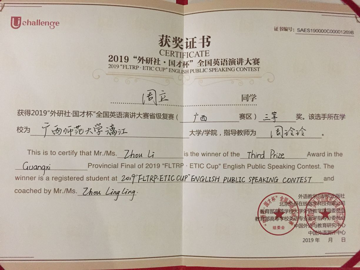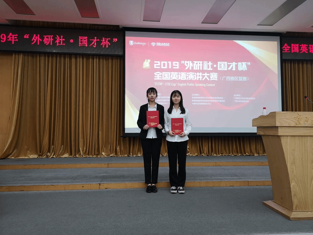 根据2019“外研社杯”全国英语演讲比赛组委会有关文件精神要求,广西区高校大学外语教学研究会于2019年11月3日在广西大学君武楼举行的“外研社杯”全国英语演讲比赛广西赛区复赛。我校2018级英语专业学生邱卓怡、周立在激烈的区级复赛中表现出色,比分在全区43名选手中,分别排名第11和17,都获得了广西区复赛三等奖。